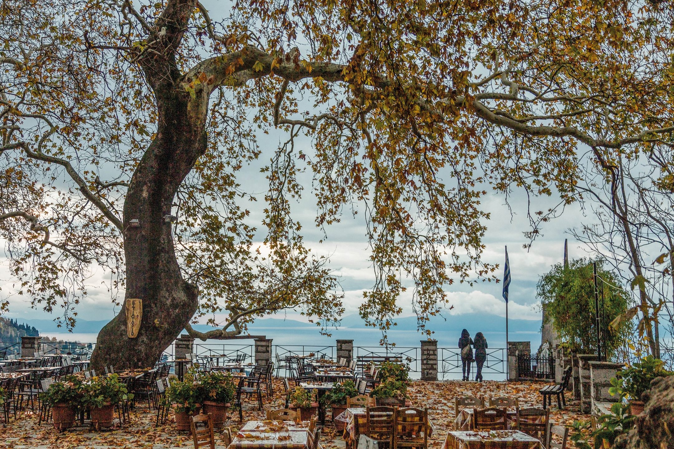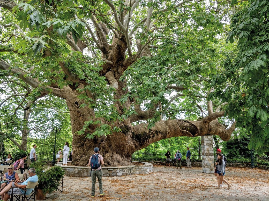 It is night time by the time we reach Tsagarada. We spend our evening at the Dipnosofistis bar-restaurant just outside the village, tasting wines from their rich cellar accompanied by light gourmet flavours. In the morning, we begin exploring Tsagarada, which proudly stretches all the way to the verdant slopes. Between the houses and the four picturesque squares we find beautiful guesthouses, good restaurants, charming cafes, traditional pastry shops, but also small bars. However, the undisputed ‘star’ of Tsagarada is actually a tree! Boasting at least a thousand years of life, Megas Platanos rises gloriously next to the church of Agia Paraskevi at the homonymous square.