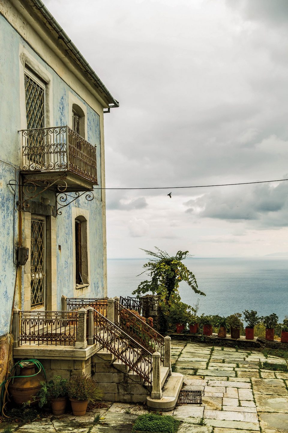 The scenery at Agios Georgios Nilias is even more vivid. Apart from the typical Pelion-style houses, you also find neoclassical mansions towering in front of you, but also colour coated houses (pink, ochre, light blue and Venetian red). And all of this, right in a breathtaking landscape. In Agios Georgios we also find the excellent Anovolio hotel and the Stefanis restaurant with delicious meze appetizers. Among other things we try goat cheese, fricassee mushrooms and tsitsiravla, the humble greens loved by the people of Pelion. They collect them in spring and consume them pickled all year round.