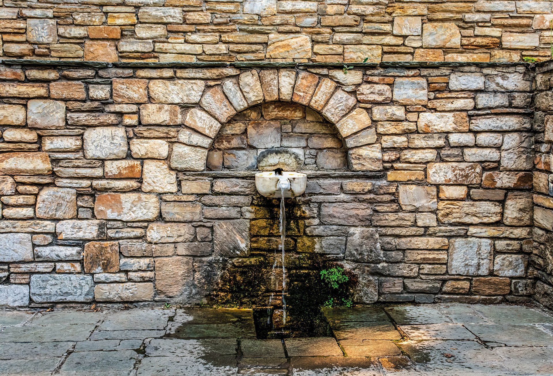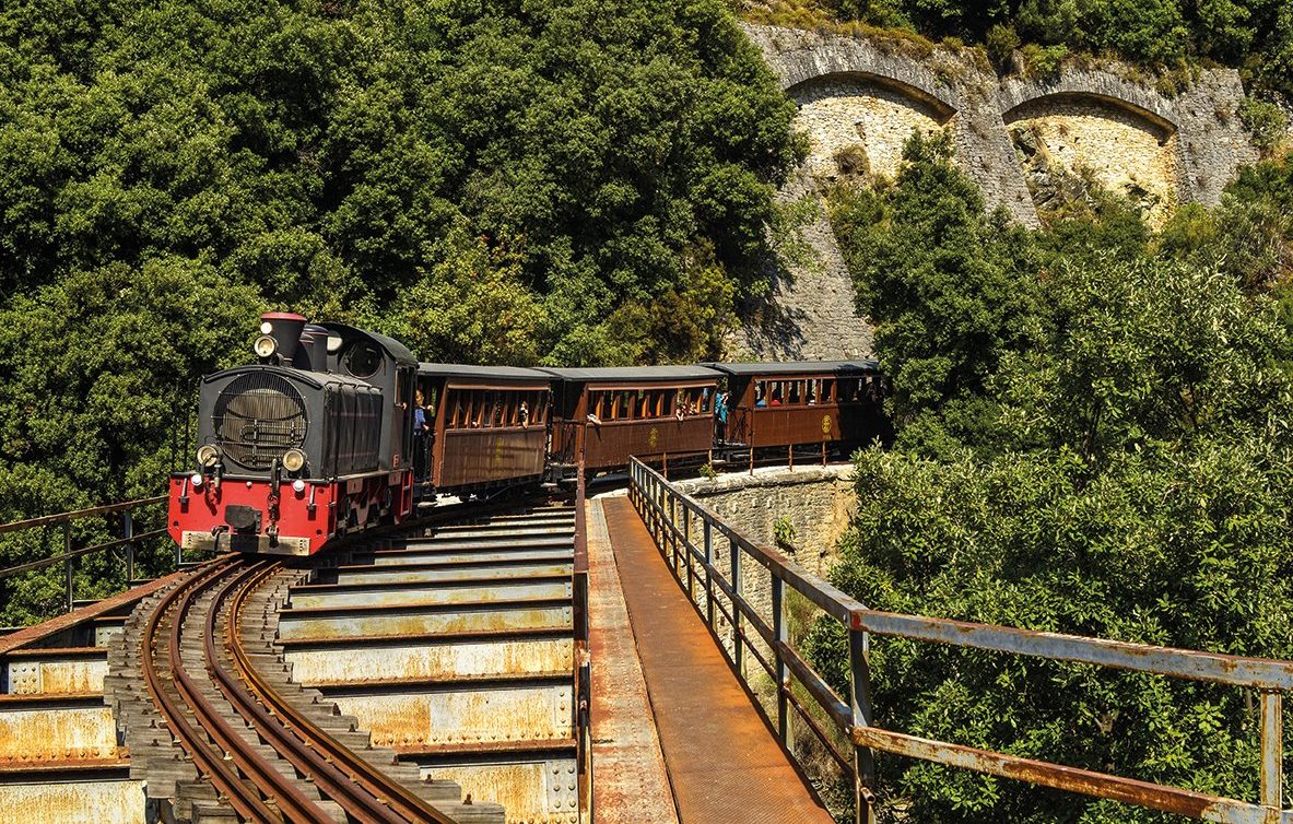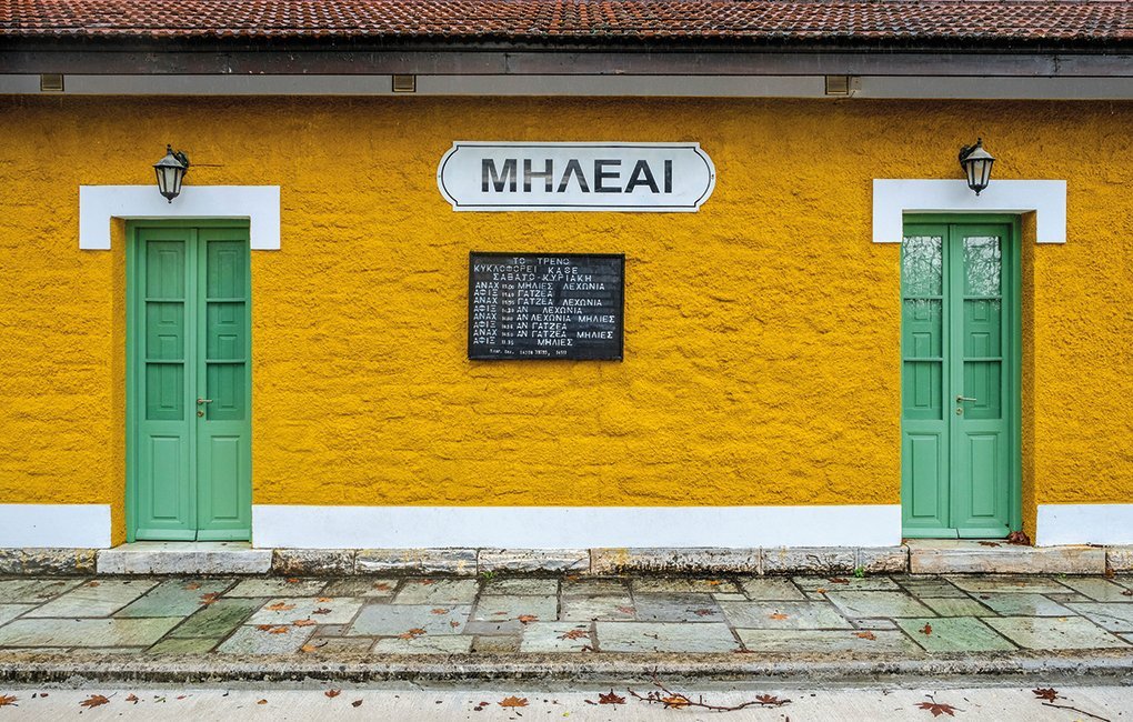 The Aegean is no longer in sight and on our left side, we have the calm waters of the Pagasetic Gulf. The landscape has once again become typical of Pelion and after a while we find ourselves at the tiny train station of Milies, the end of the line for “Moutzouris”, Pelion’s historic steam train. It began its service in 1896, covering the Volos-Milies route transporting people, livestock and merchandise. By 1971, it was no longer in operation, but in 1985 it was declared a preserved historical monument and reopened in 1996. The journey from Gatzea to Milies with the old train through the incredible mountain scenery is an unforgettable experience. Unfortunately for us, it only runs from spring to autumn, as long as weather permits. The rest of the time, the train is only available as a rental. We walk along the 60cm wide rails for about five hundred metres, until we reach a small engineering marvel from the early twentieth century: The bridge of Evaristo De Chirico as it is known, named after its creator. The rail tracks that lie on it are actually curved. Evaristo was the father of the famous Italian painter Giorgio De Chirico, who was born in Volos.